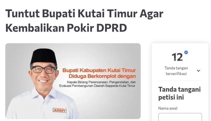 TIMUR. Sebuah petisi daring yang menuntut Bupati Kutai Timur (Kutim), Ardiansyah Sulaiman, untuk mengembalikan usulan Pokok Pikiran (Pokir) DPRD Kutim beredar di laman change.org.